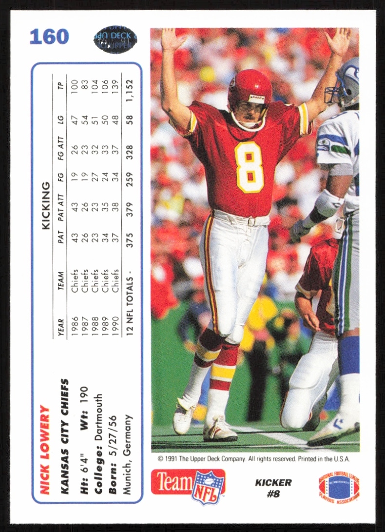 This Football card, from 1991 is part of the Upper Deck card set. Nick Lowery is featured and has a card number of 160.