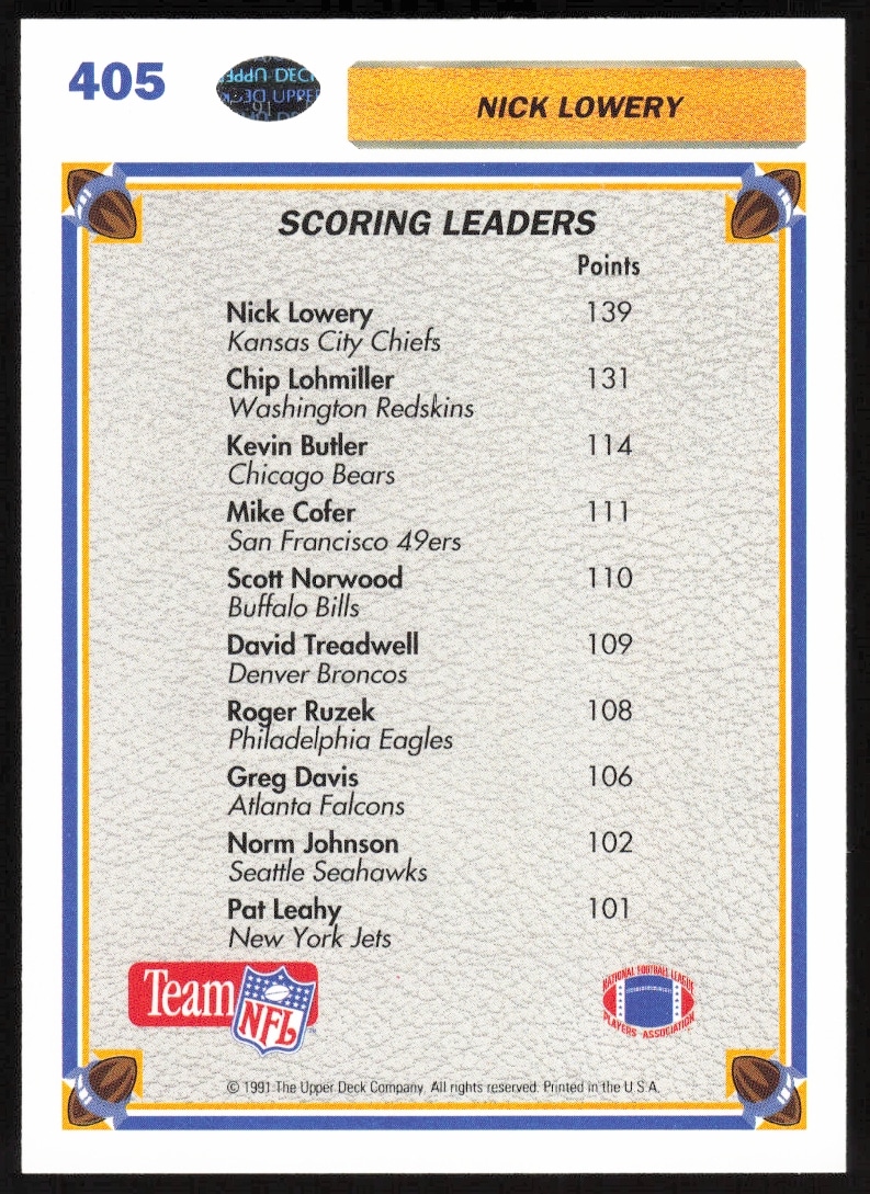 This Football card, from 1991 is part of the Upper Deck card set. Nick Lowery is featured and has a card number of 405.
