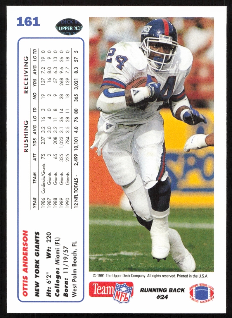 This Football card, from 1991 is part of the Upper Deck card set. Ottis Anderson is featured and has a card number of 161.