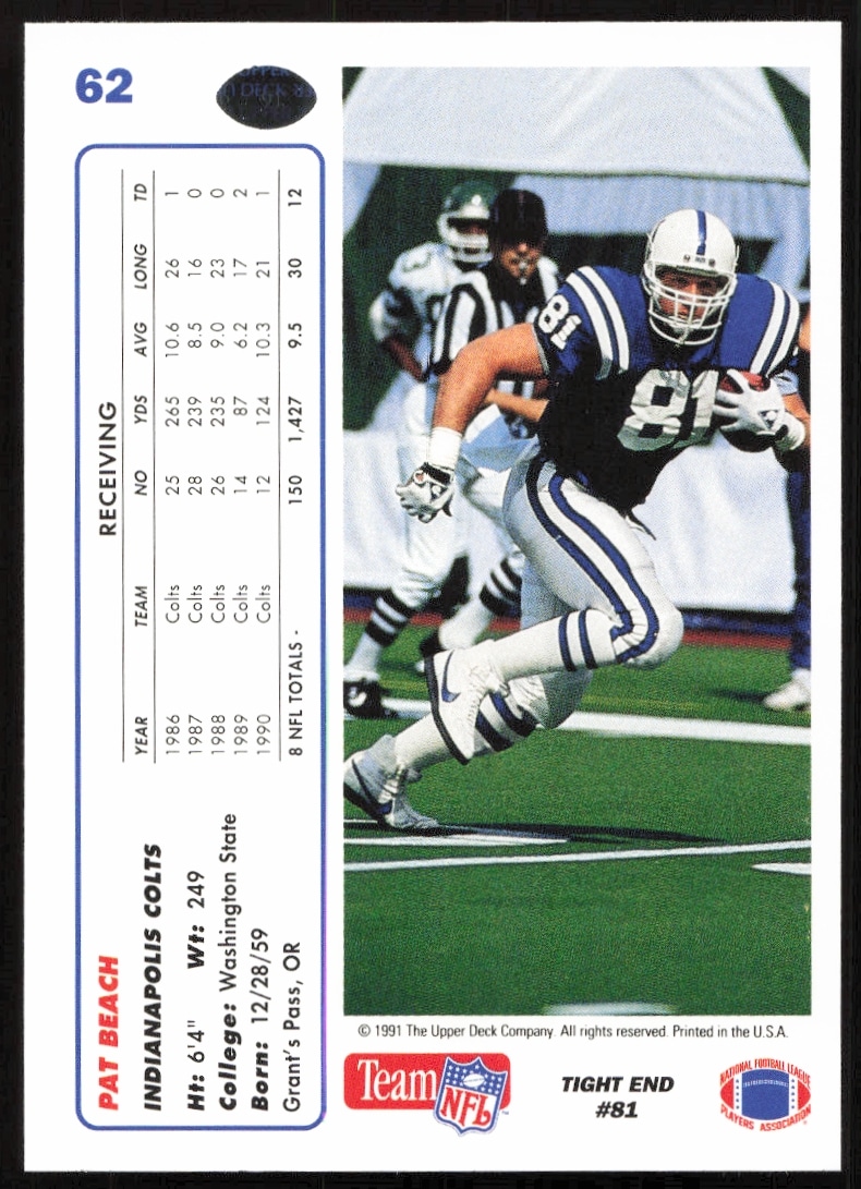 This Football card, from 1991 is part of the Upper Deck card set. Pat Beach is featured and has a card number of 62.
