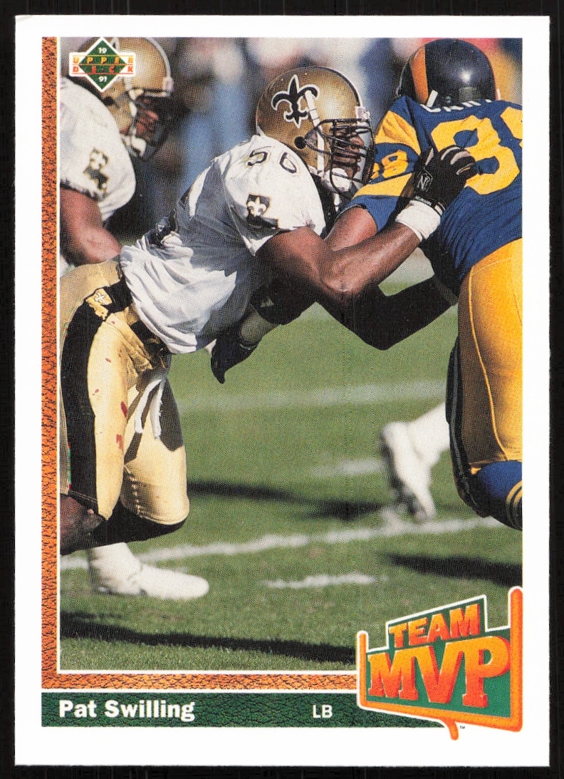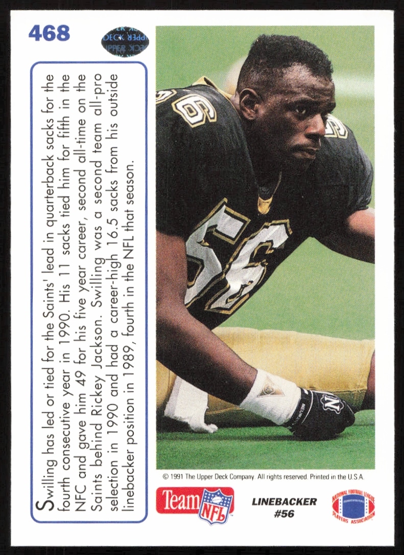 This Football card, from 1991 is part of the Upper Deck card set. Pat Swilling is featured and has a card number of 468.