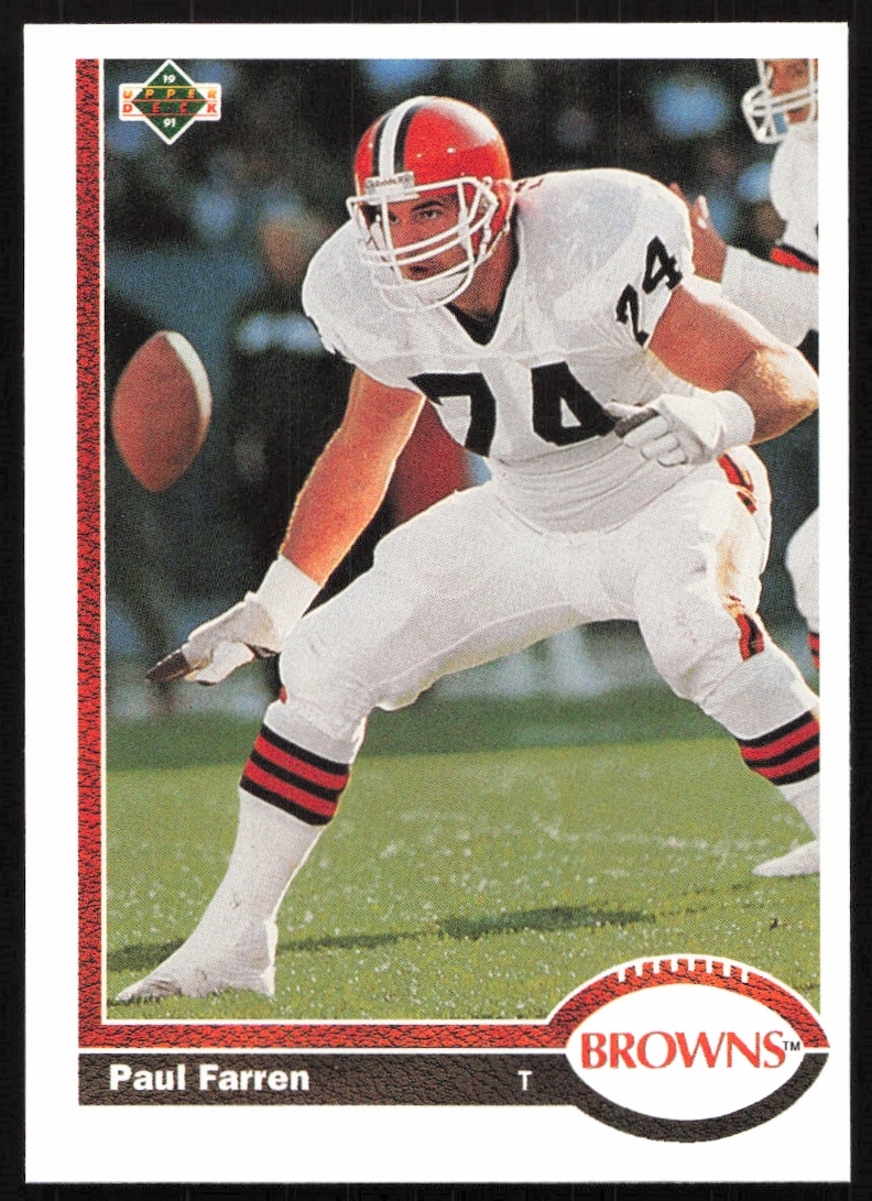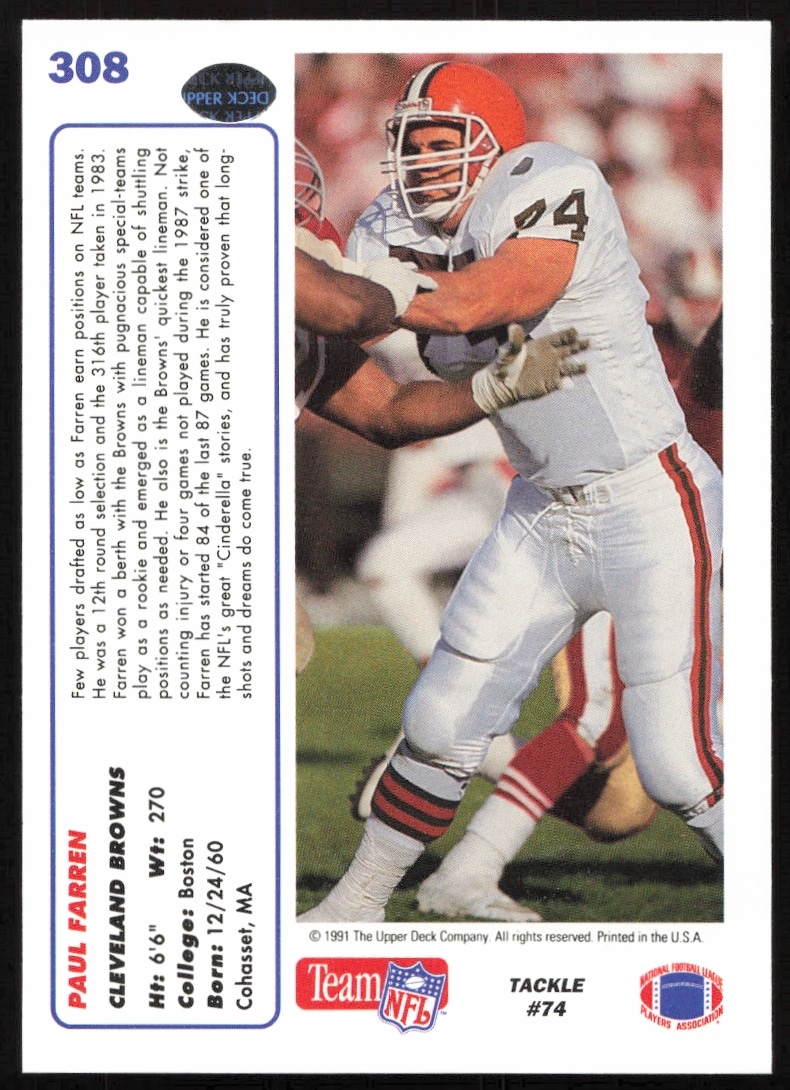 This Football card, from 1991 is part of the Upper Deck card set. Paul Farren is featured and has a card number of 308.