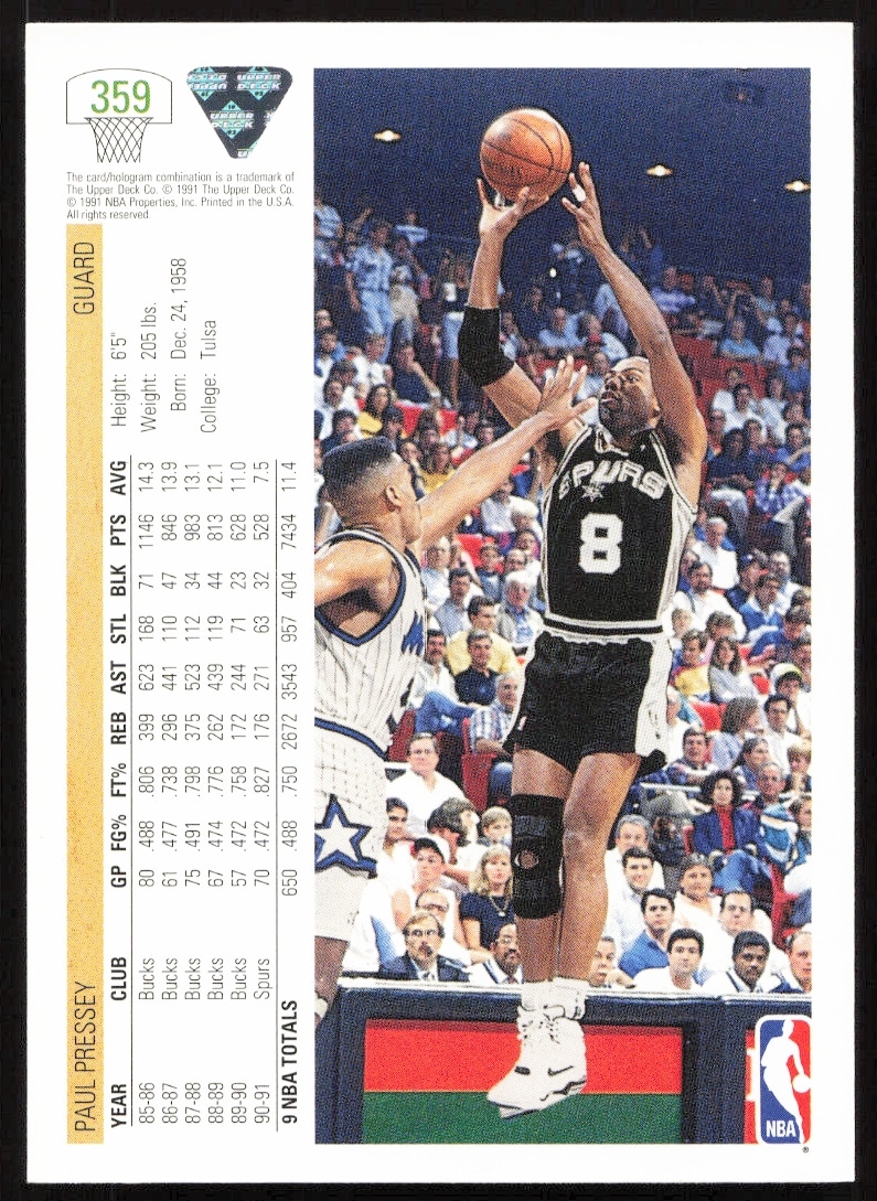 This Basketball card, from 1991-92 is part of the Upper Deck card set. Paul Pressey is featured and has a card number of 359.