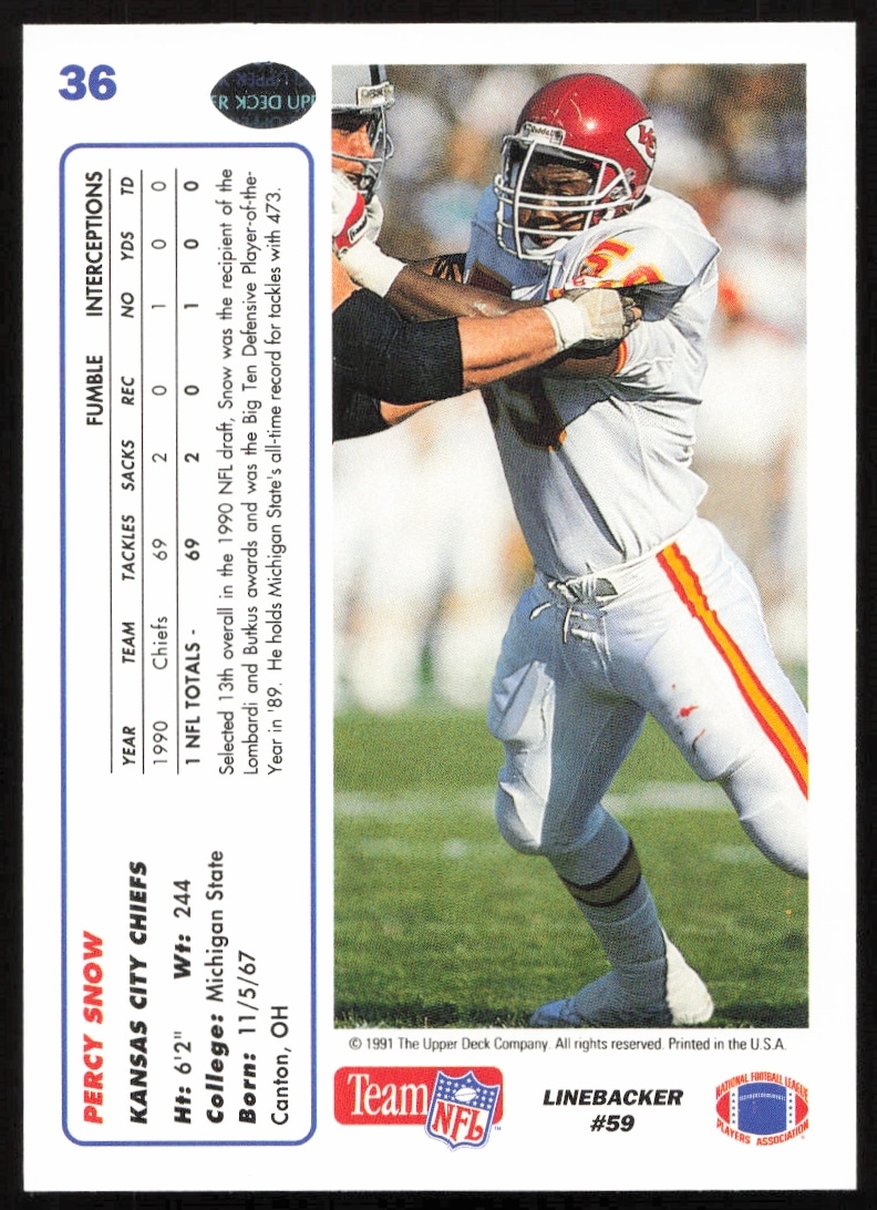 This Football card, from 1991 is part of the Upper Deck card set. Percy Snow is featured and has a card number of 36.