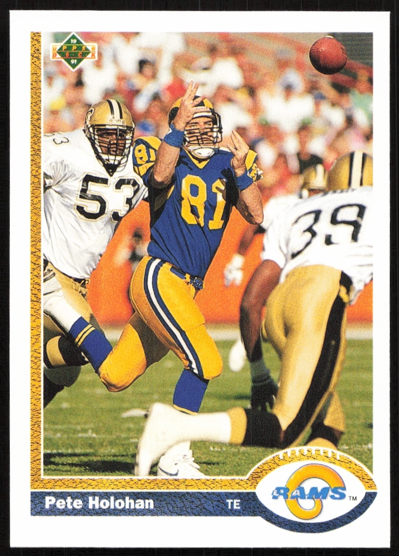 This Football card, from 1991 is part of the Upper Deck card set. Pete Holohan is featured and has a card number of 182.