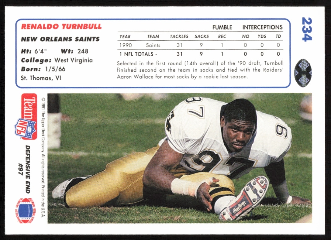 This Football card, from 1991 is part of the Upper Deck card set. Renaldo Turnbull is featured and has a card number of 234.
