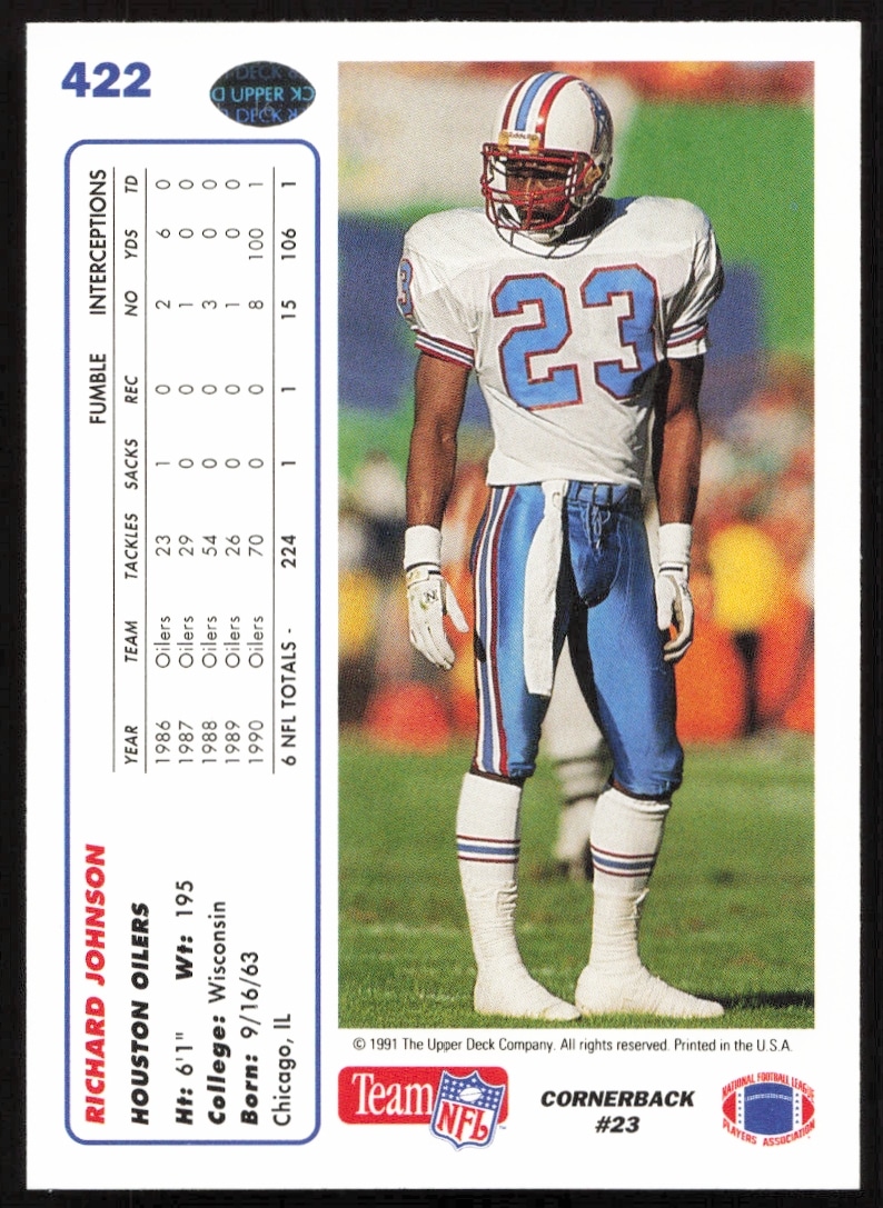 This Football card, from 1991 is part of the Upper Deck card set. Richard Johnson is featured and has a card number of 422.