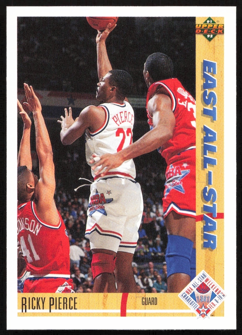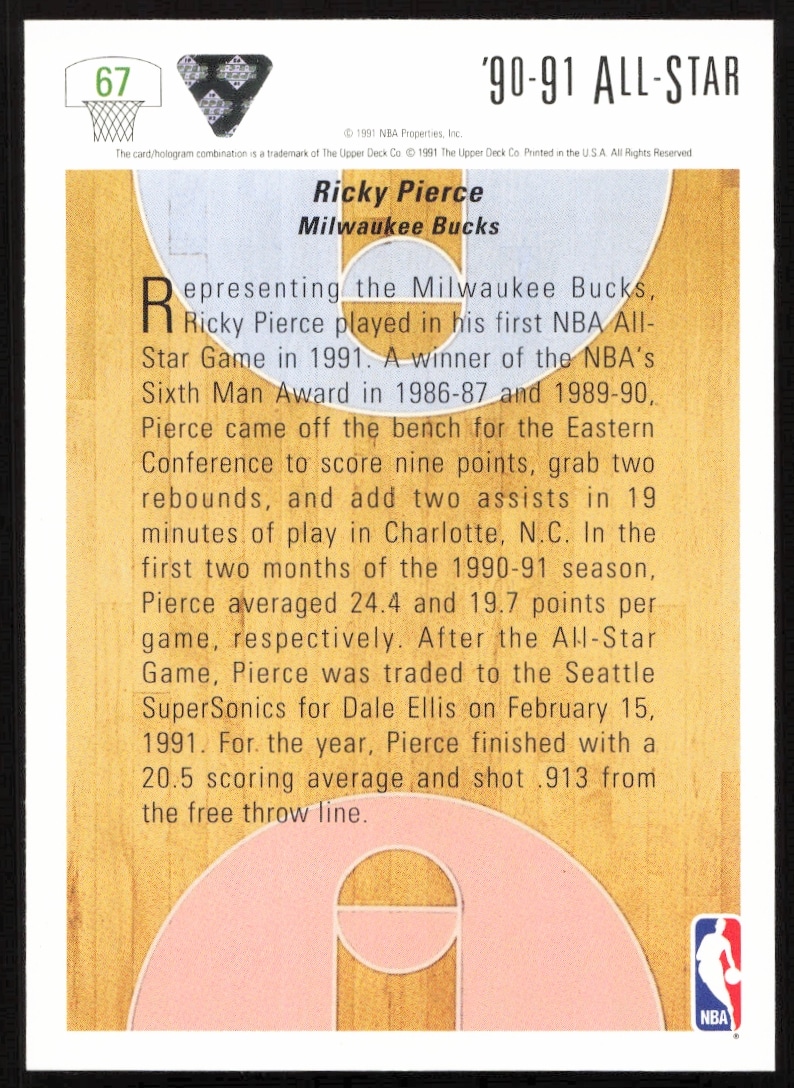 This Basketball card, from 1991-92 is part of the Upper Deck card set. Ricky Pierce is featured and has a card number of 67.