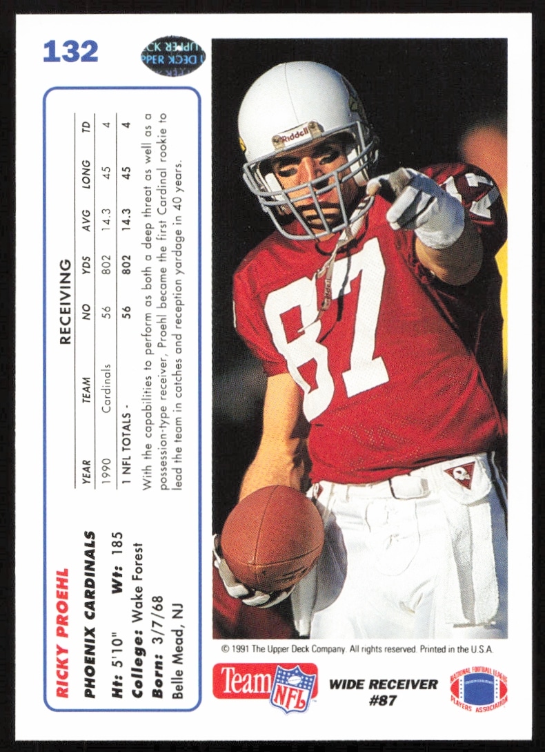This Football card, from 1991 is part of the Upper Deck card set. Ricky Proehl is featured and has a card number of 132.
