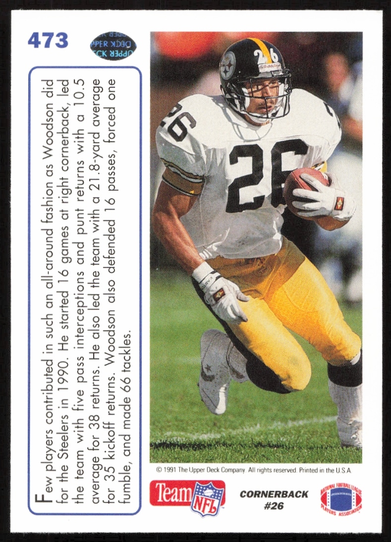 This Football card, from 1991 is part of the Upper Deck card set. Rod Woodson is featured and has a card number of 473.