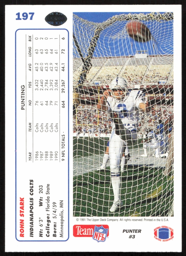 This Football card, from 1991 is part of the Upper Deck card set. Rohn Stark is featured and has a card number of 197.