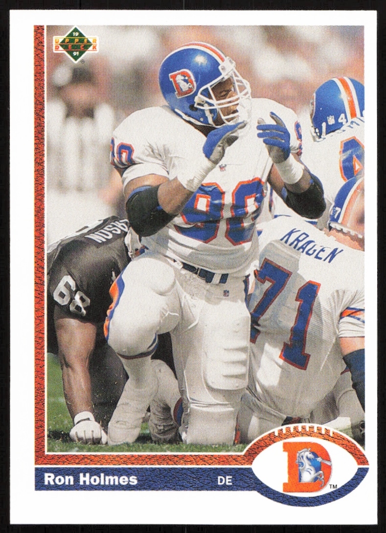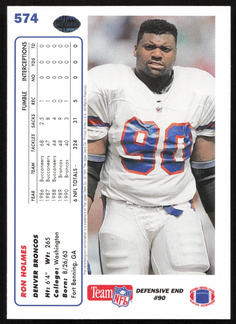 This Football card, from 1991 is part of the Upper Deck card set. Ron Holmes is featured and has a card number of 574.
