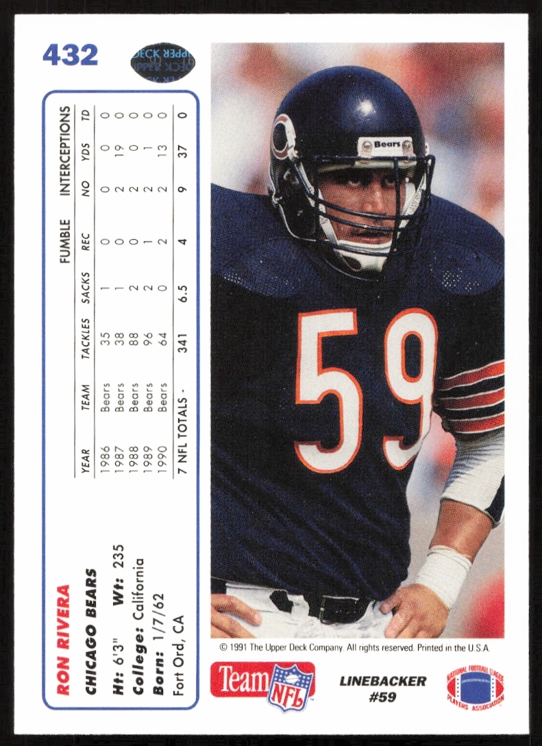 This Football card, from 1991 is part of the Upper Deck card set. Ron Rivera is featured and has a card number of 432.