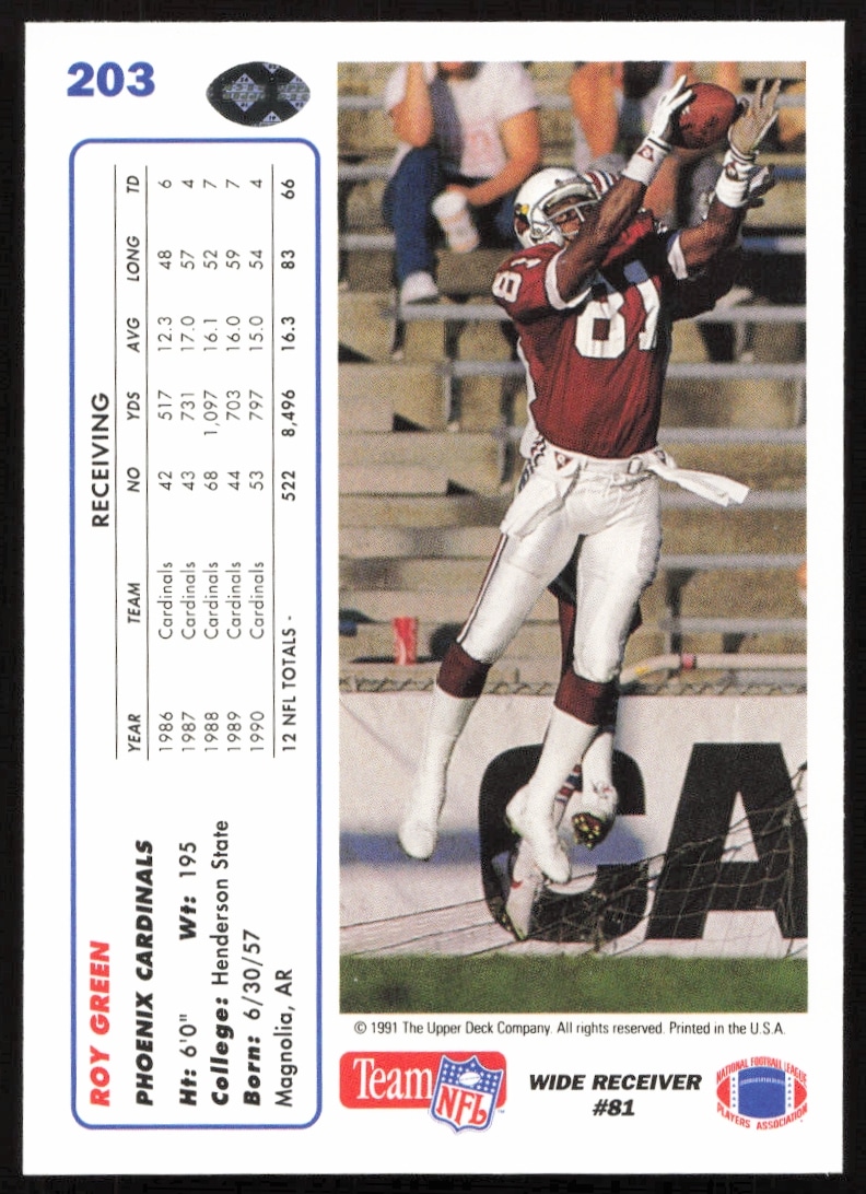 This Football card, from 1991 is part of the Upper Deck card set. Roy Green is featured and has a card number of 203.