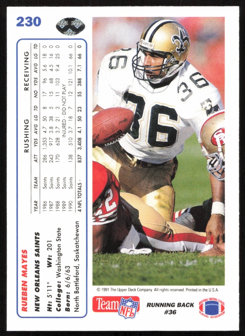 This Football card, from 1991 is part of the Upper Deck card set. Rueben Mayes is featured and has a card number of 230.