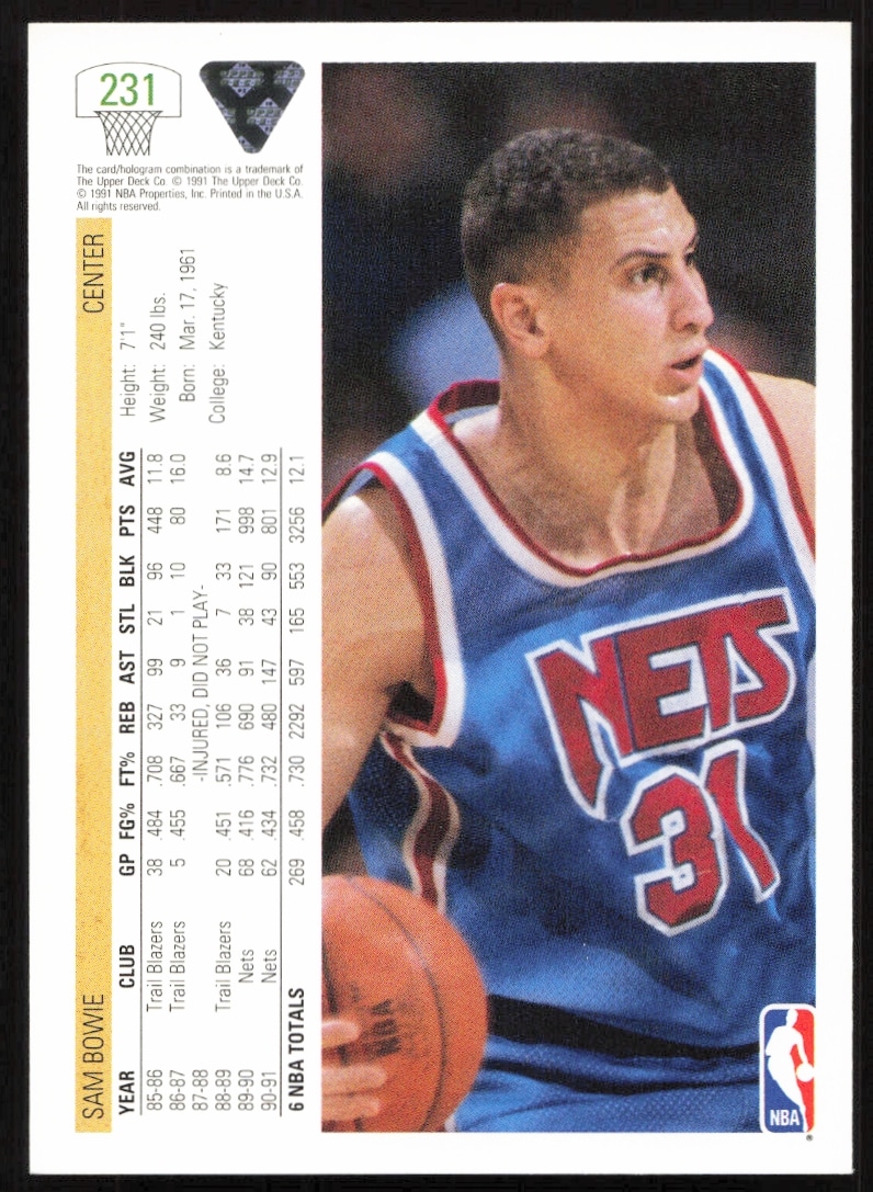 This Basketball card, from 1991-92 is part of the Upper Deck card set. Sam Bowie is featured and has a card number of 231.