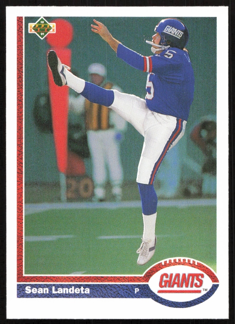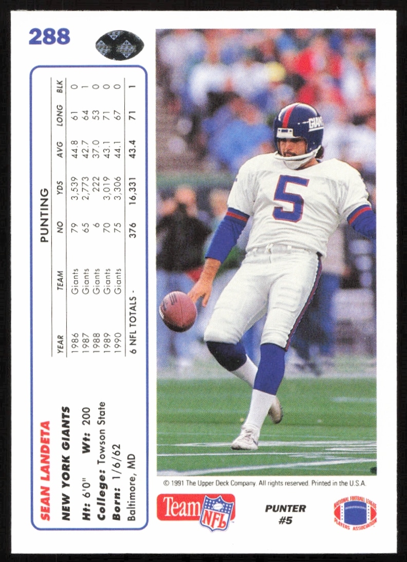 This Football card, from 1991 is part of the Upper Deck card set. Sean Landeta is featured and has a card number of 288.