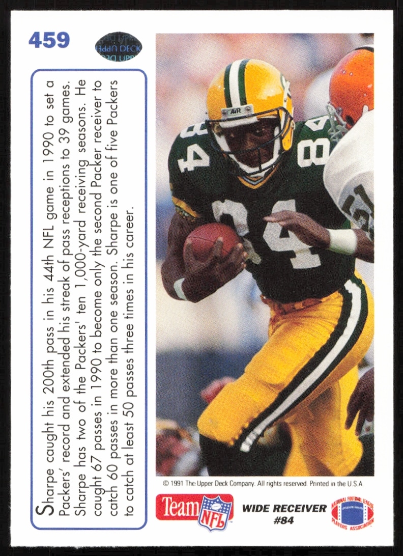 This Football card, from 1991 is part of the Upper Deck card set. Sterling Sharpe is featured and has a card number of 459.