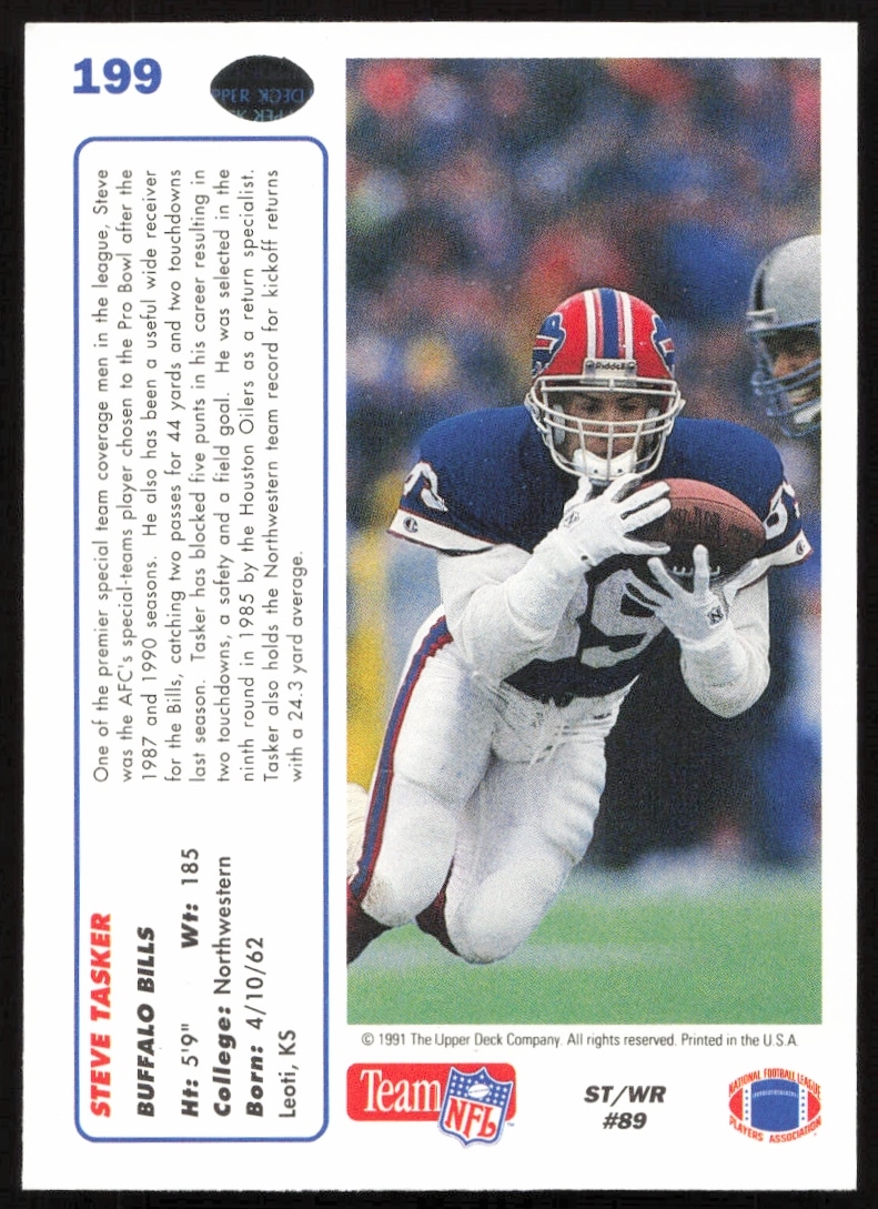 This Football card, from 1991 is part of the Upper Deck card set. Steve Tasker is featured and has a card number of 199.