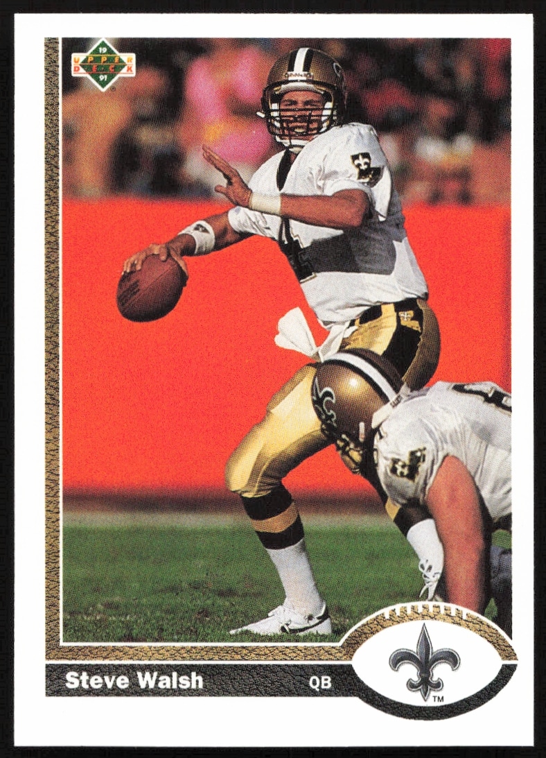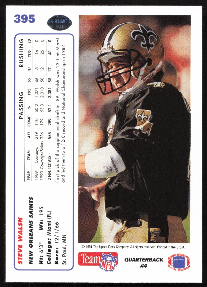 This Football card, from 1991 is part of the Upper Deck card set. Steve Walsh is featured and has a card number of 395.