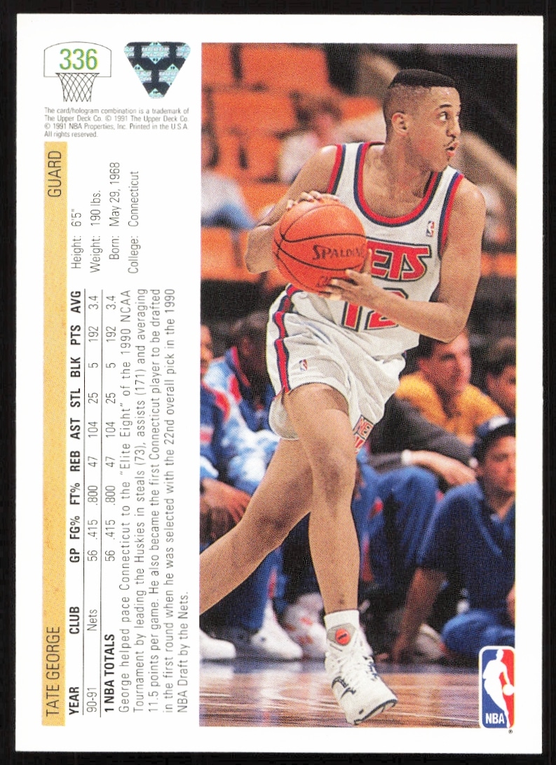This Basketball card, from 1991-92 is part of the Upper Deck card set. Tate George is featured and has a card number of 336.