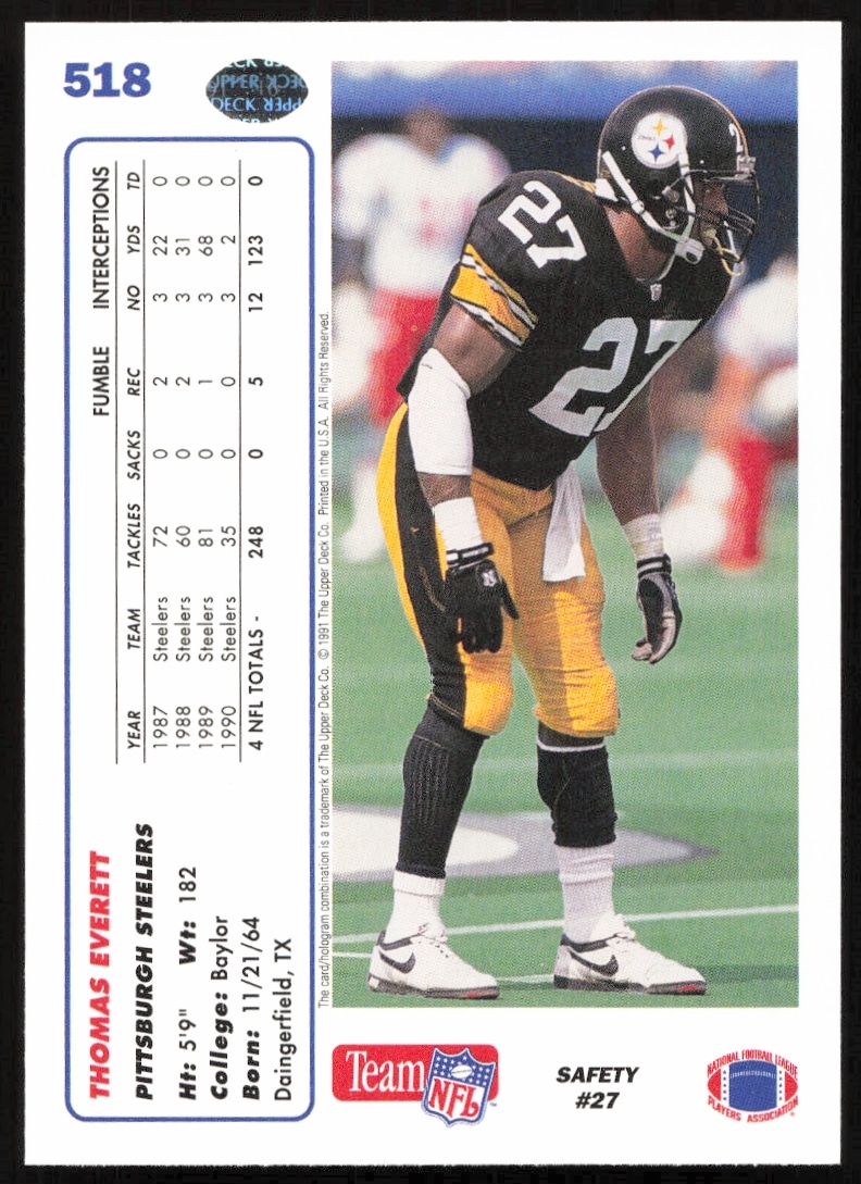 This Football card, from 1991 is part of the Upper Deck card set. Thomas Everett is featured and has a card number of 518.