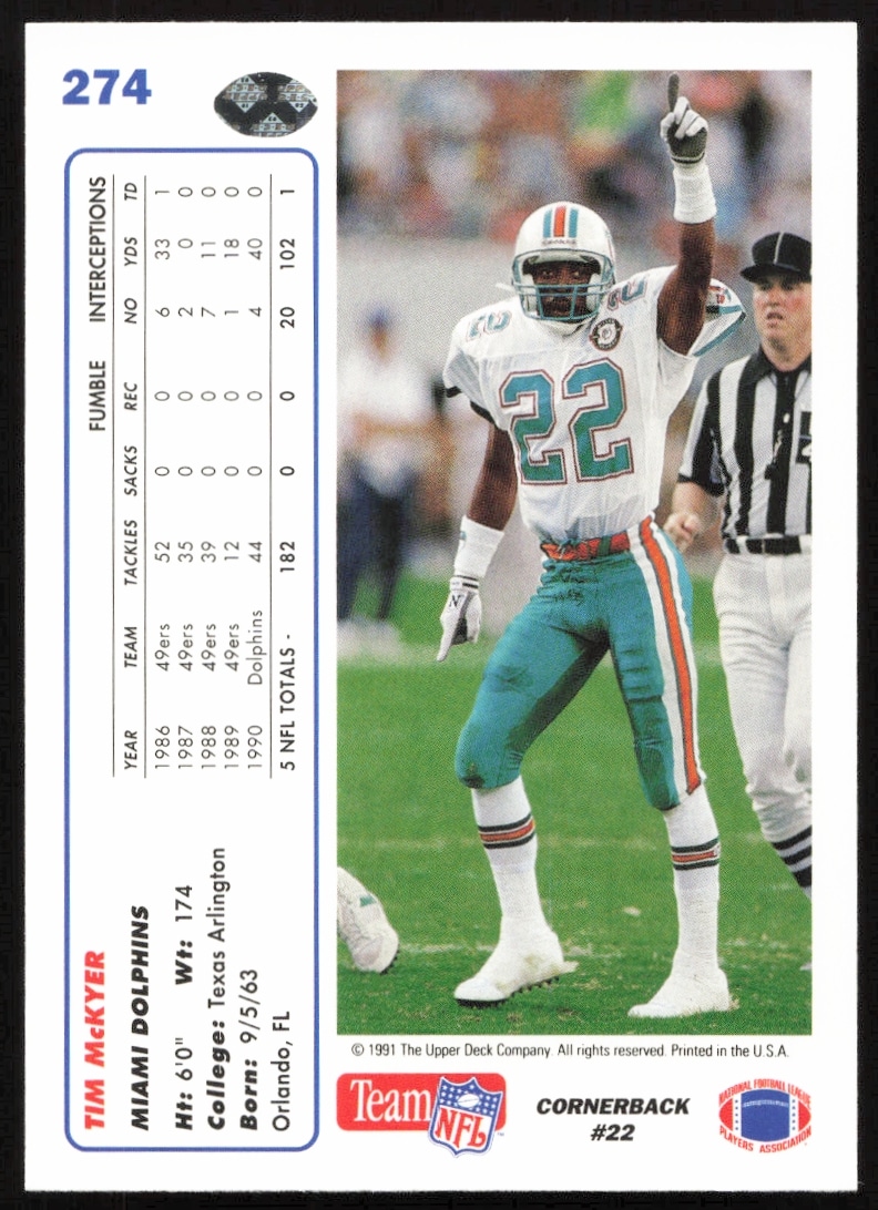This Football card, from 1991 is part of the Upper Deck card set. Tim McKyer is featured and has a card number of 274.