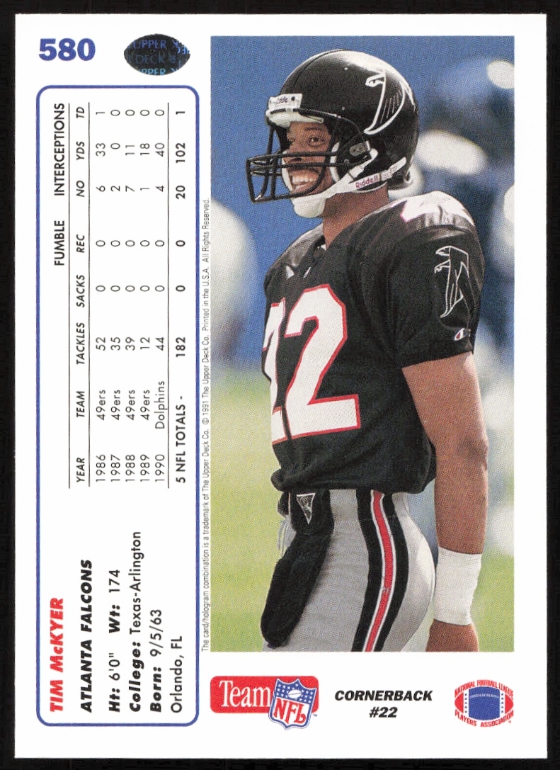 This Football card, from 1991 is part of the Upper Deck card set. Tim McKyer is featured and has a card number of 580.