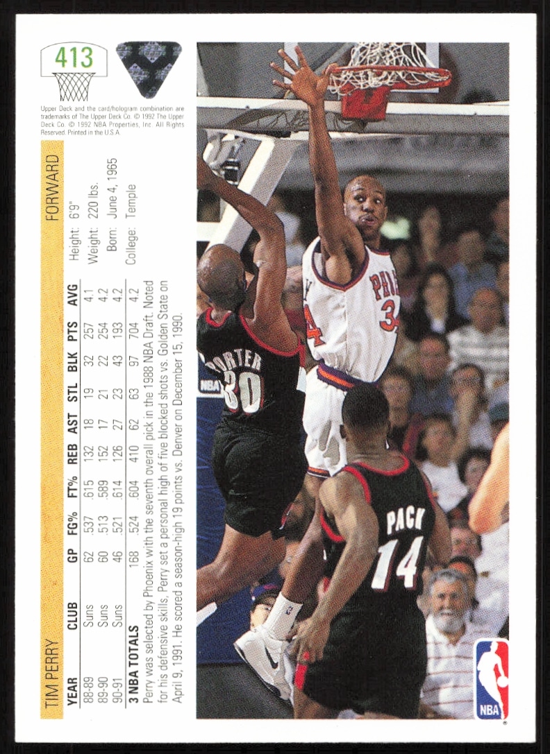 This Basketball card, from 1991-92 is part of the Upper Deck card set. Tim Perry is featured and has a card number of 413.