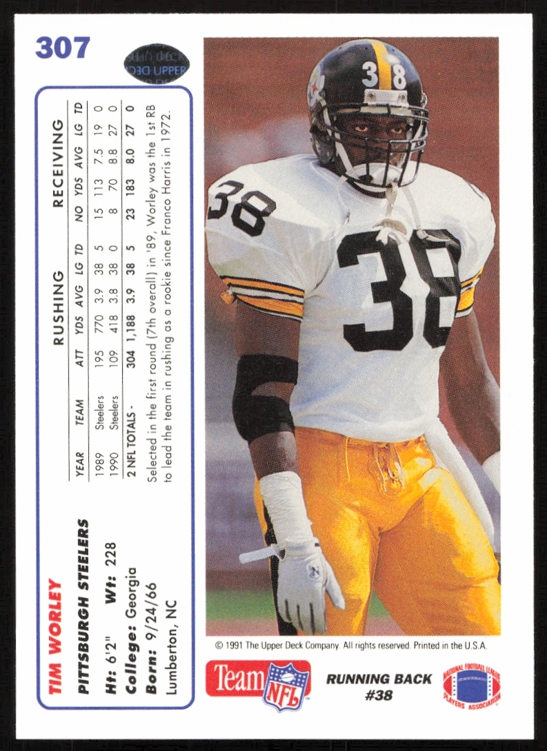 This Football card, from 1991 is part of the Upper Deck card set. Tim Worley is featured and has a card number of 307.