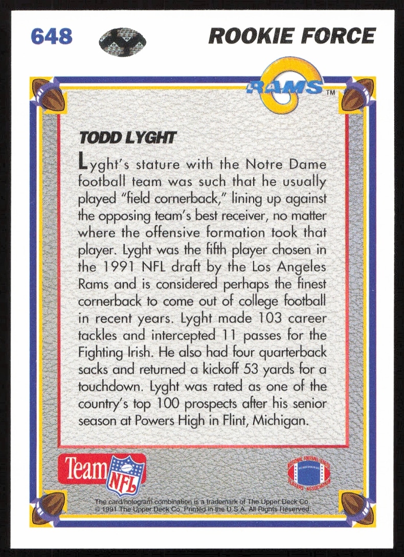 This Football card, from 1991 is part of the Upper Deck card set. Todd Lyght is featured and has a card number of 648.