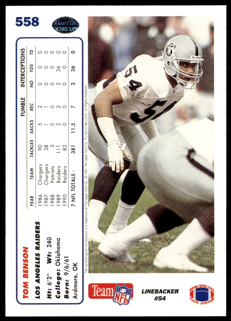 This Football card, from 1991 is part of the Upper Deck card set. Tom Benson is featured and has a card number of 558.
