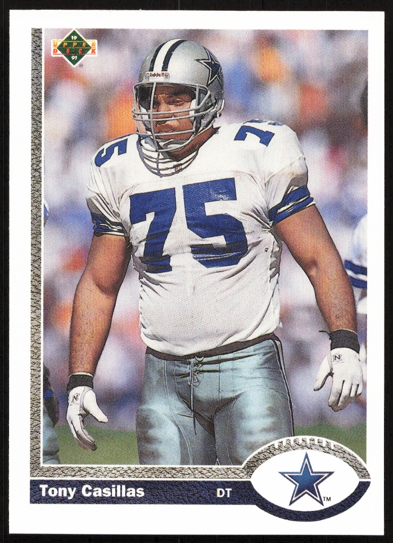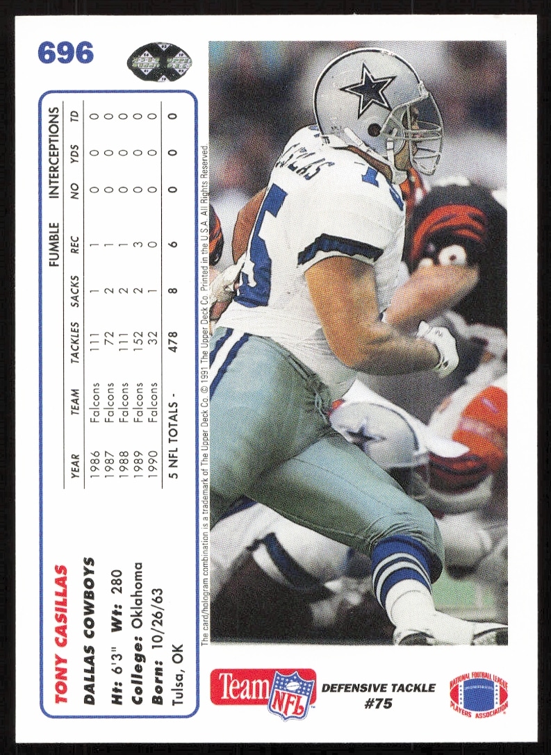 This Football card, from 1991 is part of the Upper Deck card set. Tony Casillas is featured and has a card number of 696.
