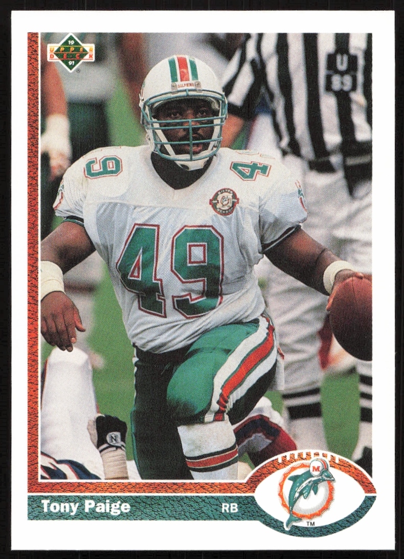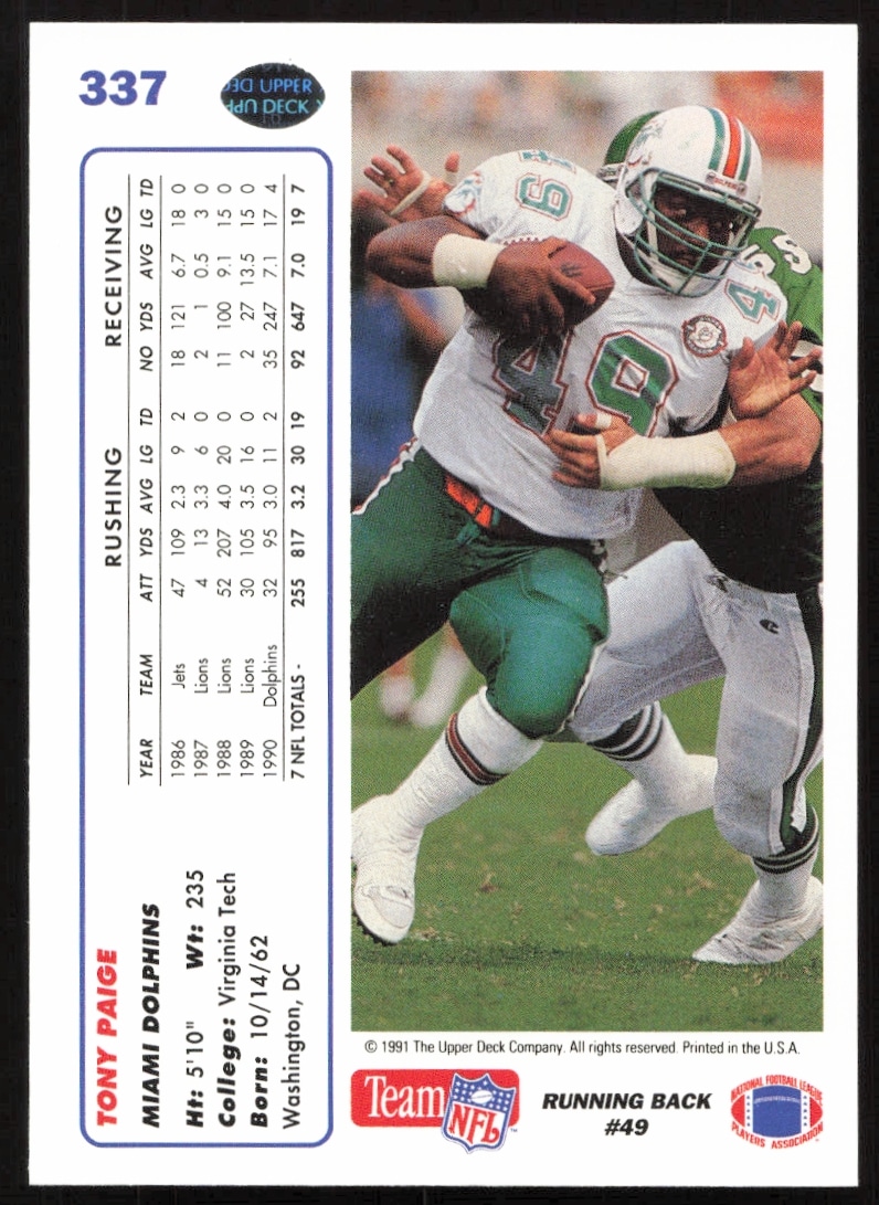 This Football card, from 1991 is part of the Upper Deck card set. Tony Paige is featured and has a card number of 337.
