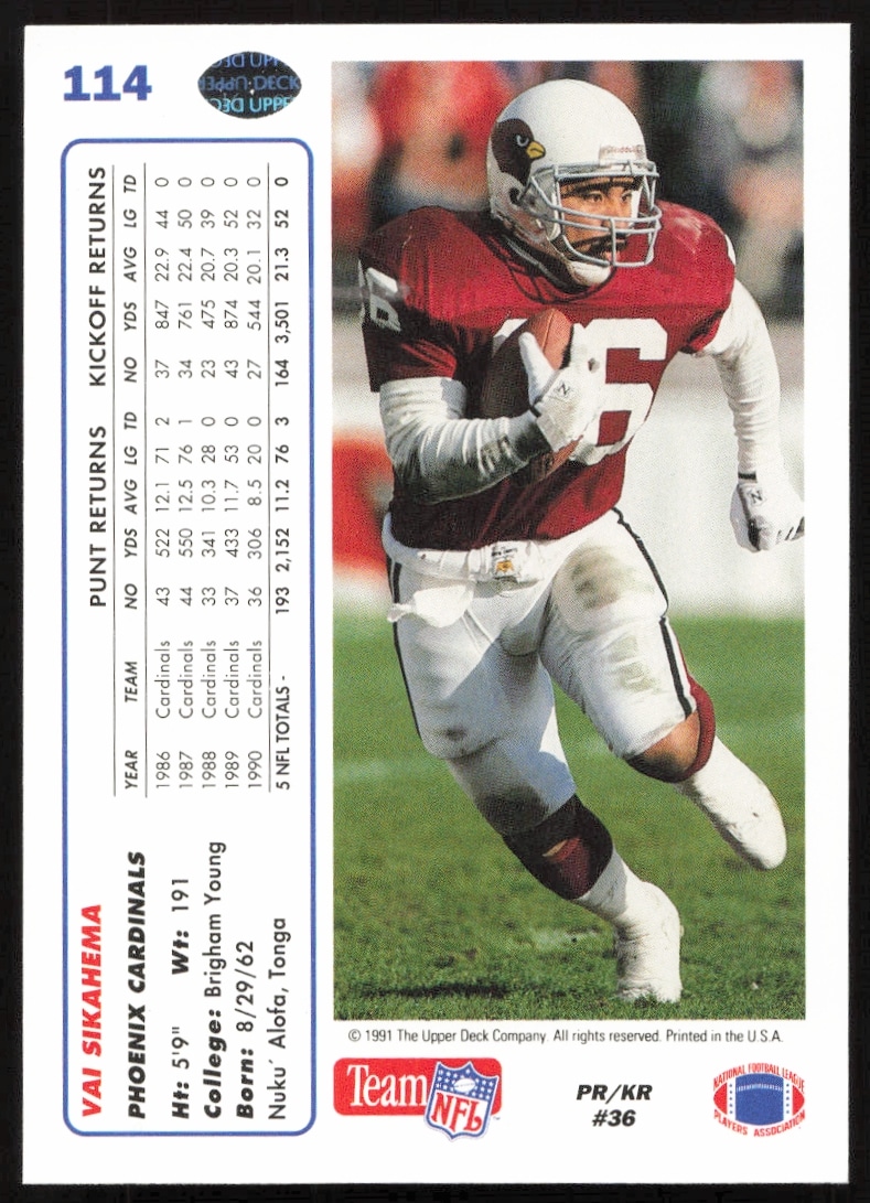This Football card, from 1991 is part of the Upper Deck card set. Vai Sikahema is featured and has a card number of 114.