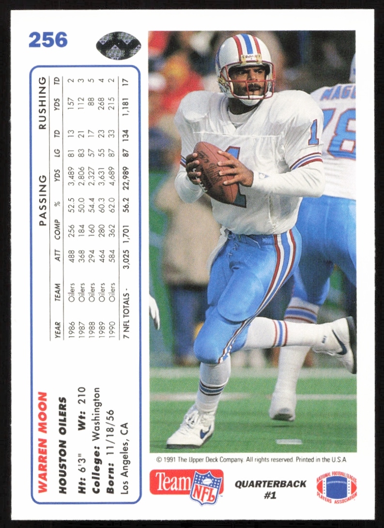 This Football card, from 1991 is part of the Upper Deck card set. Warren Moon is featured and has a card number of 256.