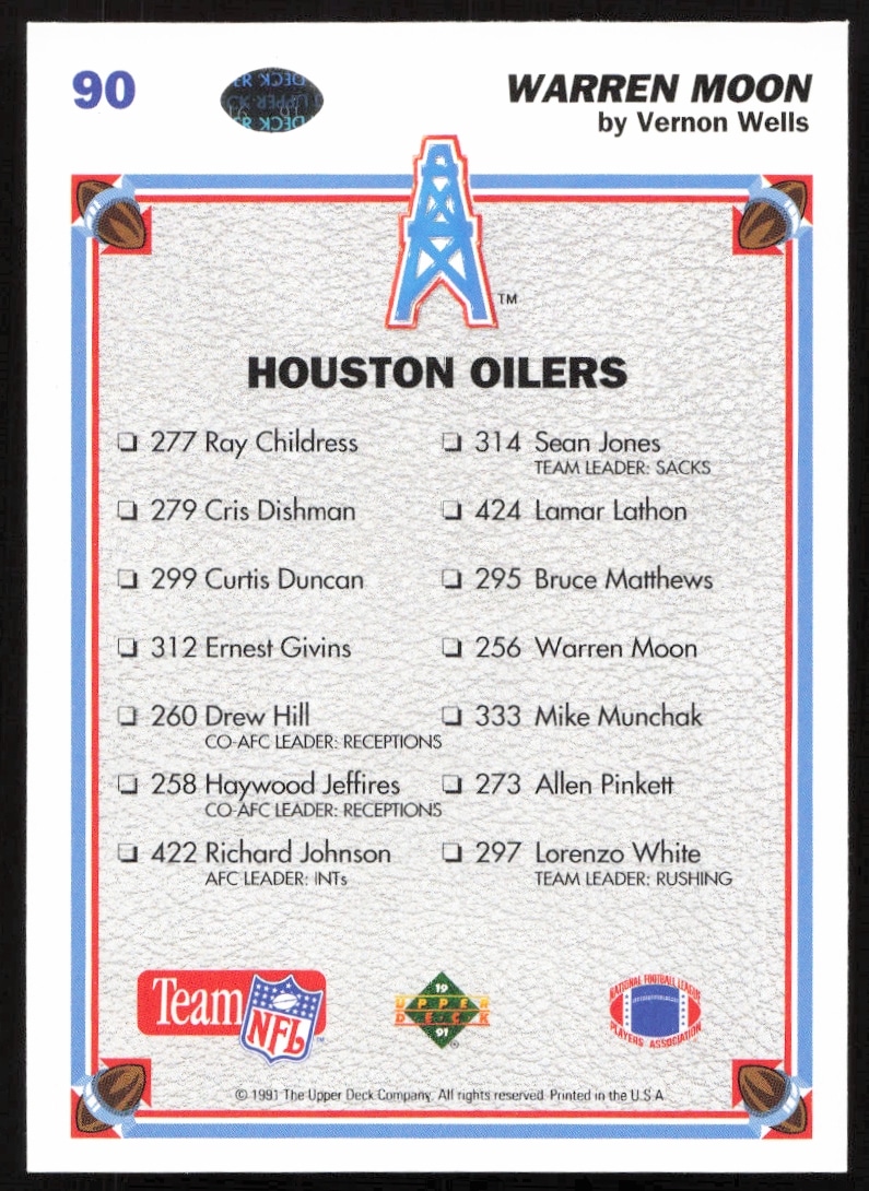 This Football card, from 1991 is part of the Upper Deck card set. Warren Moon is featured and has a card number of 90.
