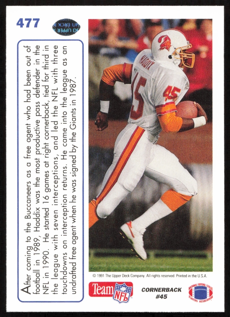 This Football card, from 1991 is part of the Upper Deck card set. Wayne Haddix is featured and has a card number of 477.