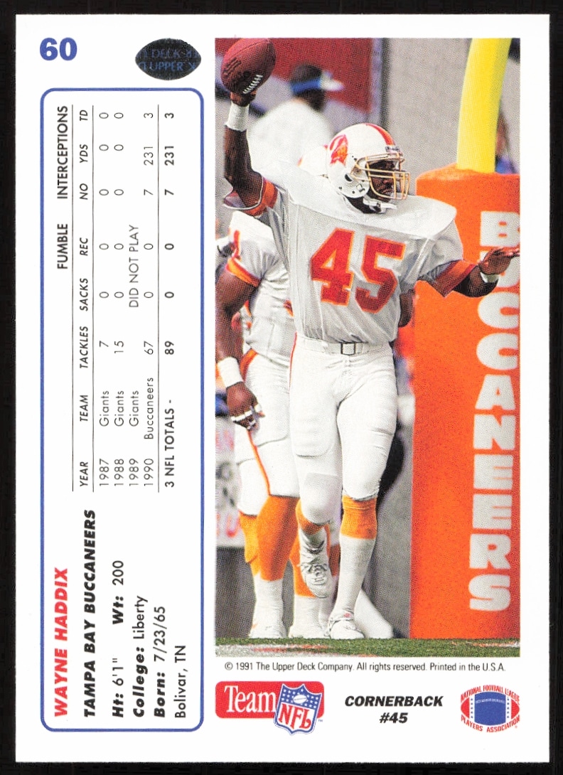 This Football card, from 1991 is part of the Upper Deck card set. Wayne Haddix is featured and has a card number of 60.