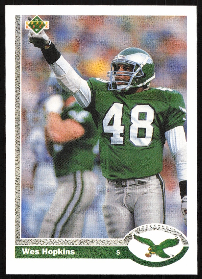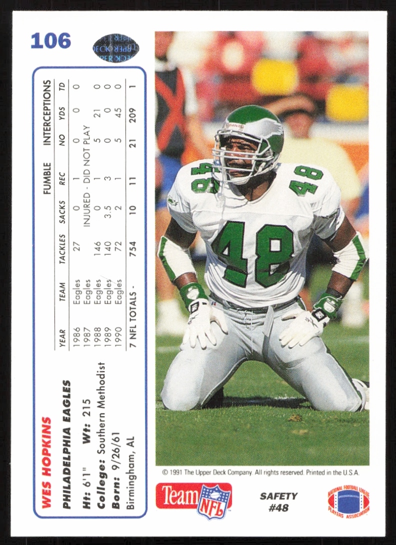 This Football card, from 1991 is part of the Upper Deck card set. Wes Hopkins is featured and has a card number of 106.