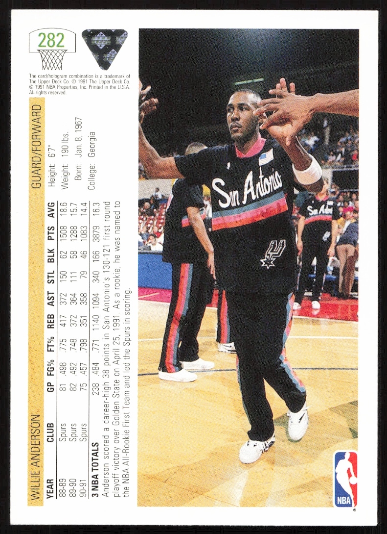 This Basketball card, from 1991-92 is part of the Upper Deck card set. Willie Anderson is featured and has a card number of 282.