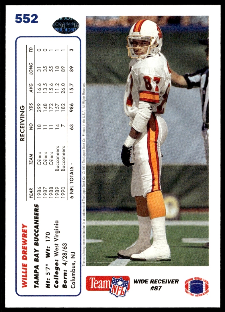 This Football card, from 1991 is part of the Upper Deck card set. Willie Drewrey is featured and has a card number of 552.