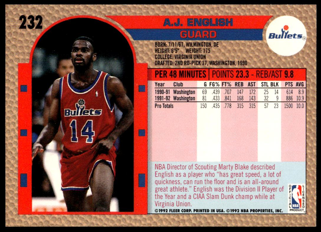This Basketball card, from 1992-93 is part of the Fleer  card set. A.J. English is featured and has a card number of 232.