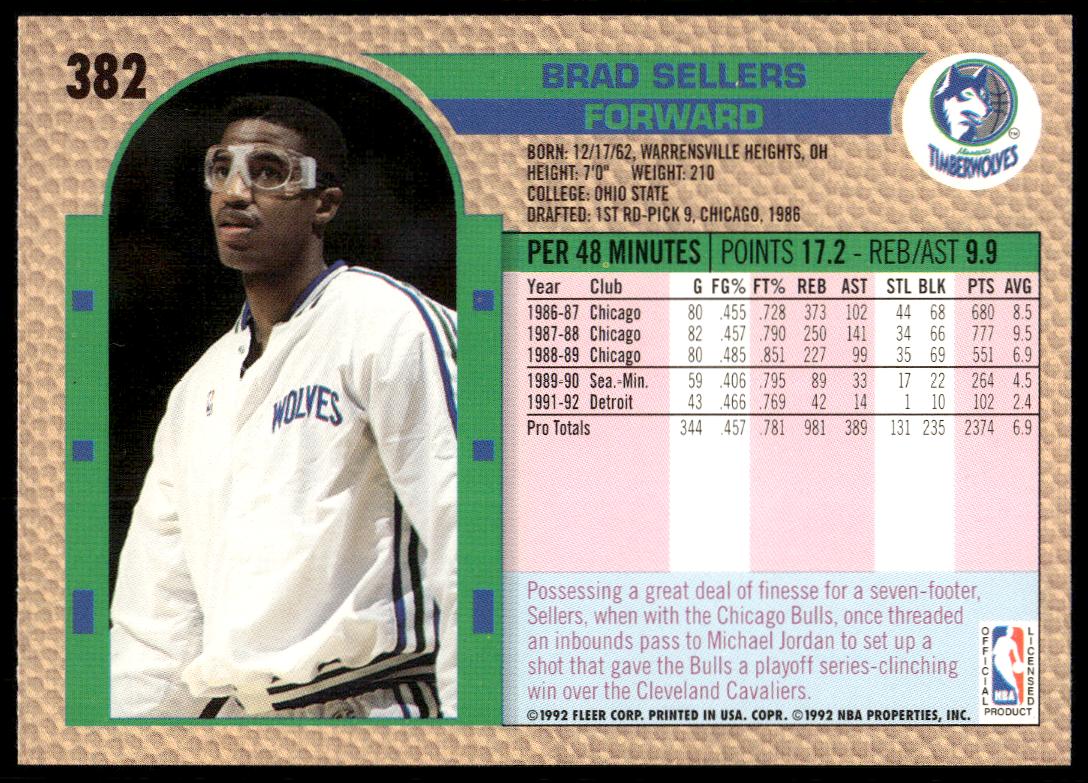 This Basketball card, from 1992-93 is part of the Fleer  card set. Brad Sellers is featured and has a card number of 382.
