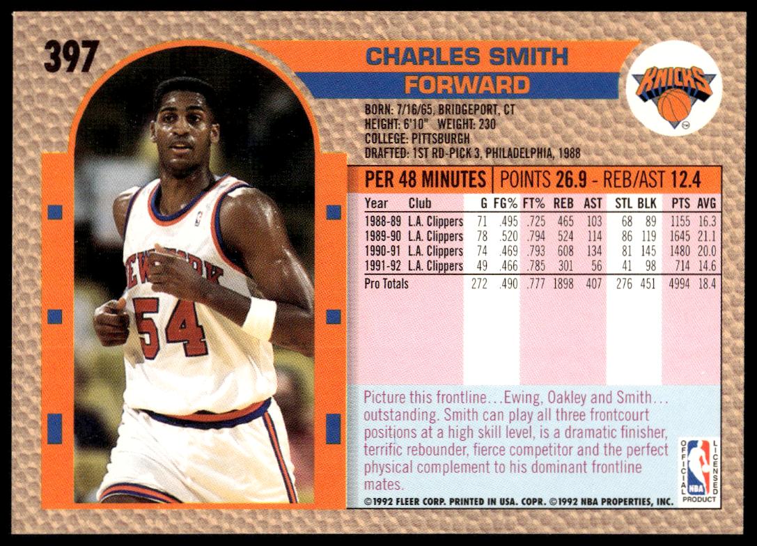 This Basketball card, from 1992-93 is part of the Fleer  card set. Charles Smith is featured and has a card number of 397.