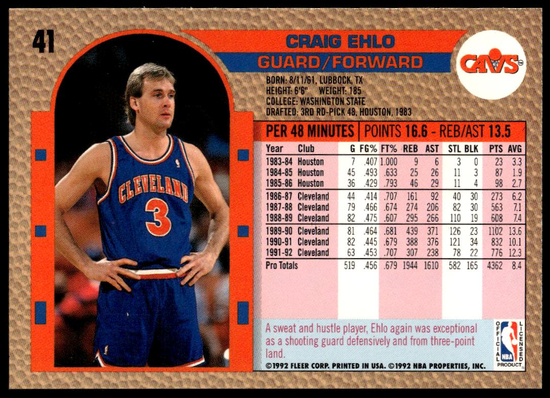 This Basketball card, from 1992-93 is part of the Fleer  card set. Craig Ehlo is featured and has a card number of 41.