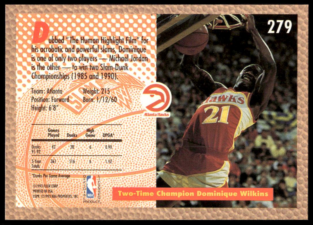 This BasketballΒ card, from 1992-93 is part of the Fleer Β card set. Dominique Wilkins is featured and has a card number of 279.