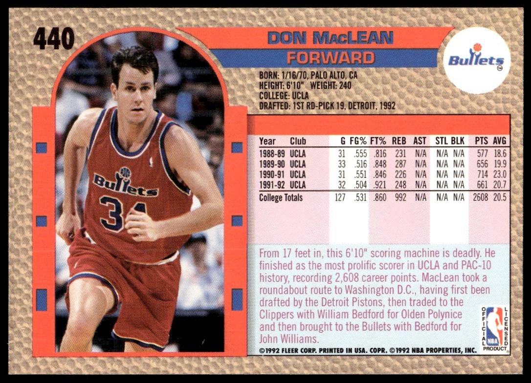 This Basketball card, from 1992-93 is part of the Fleer  card set. Don MacLean is featured and has a card number of 440.