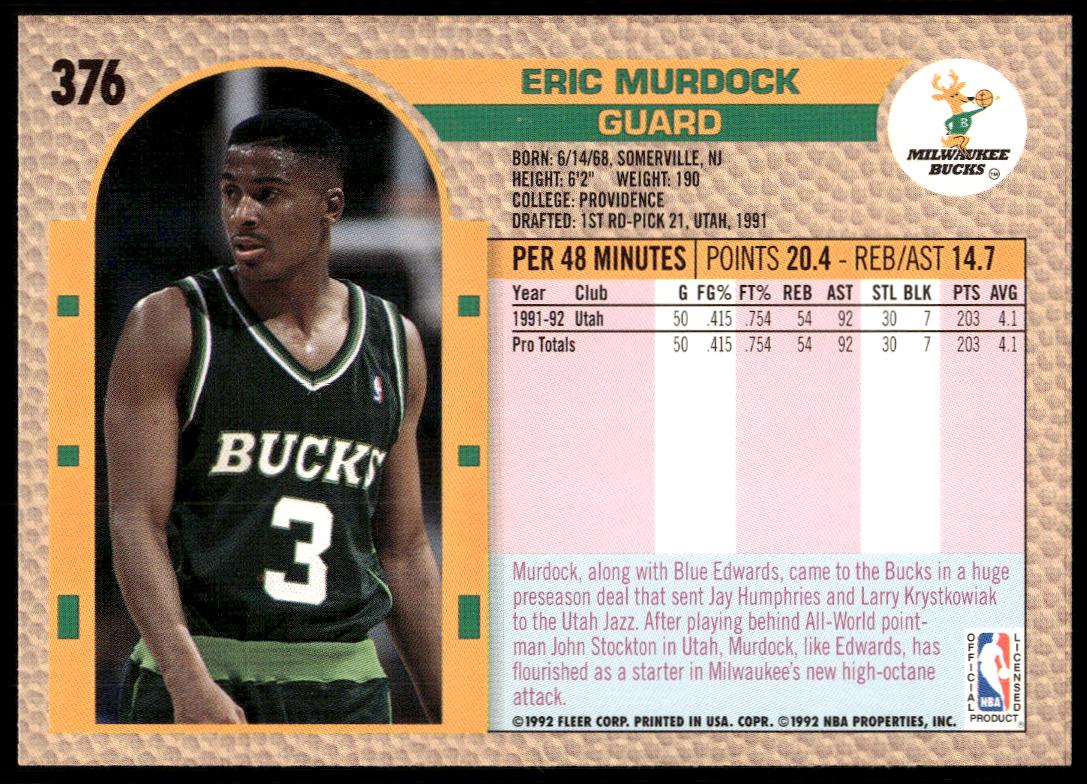 This Basketball card, from 1992-93 is part of the Fleer  card set. Eric Murdock is featured and has a card number of 376.