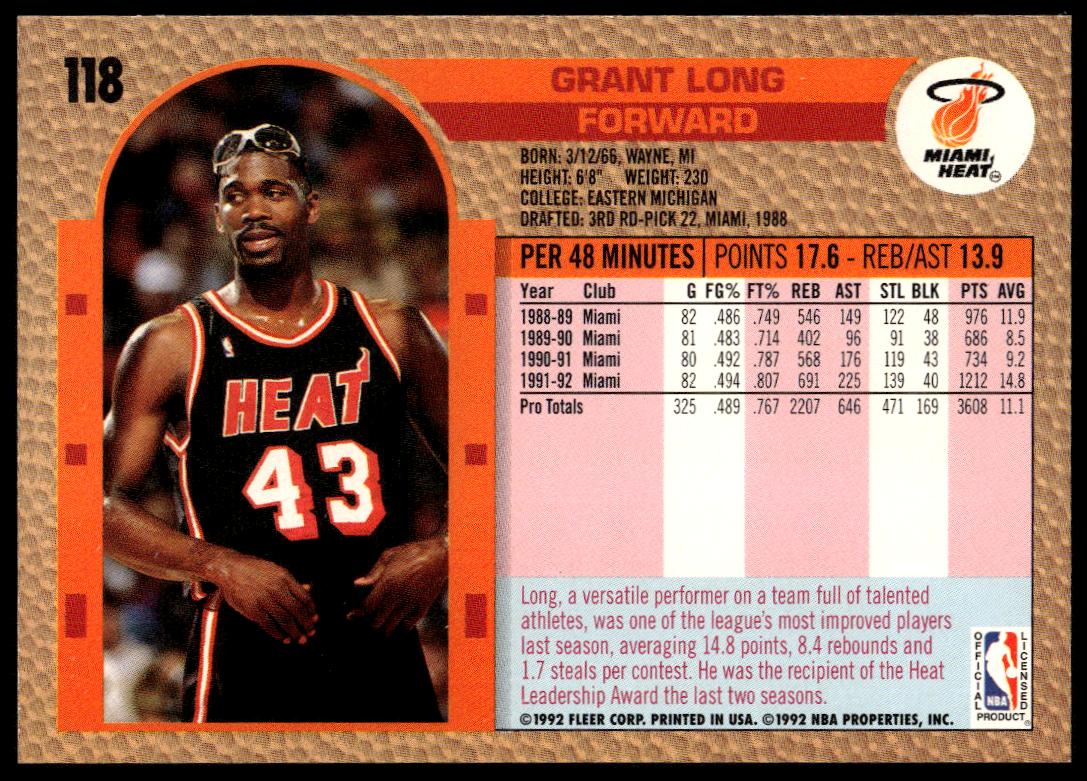 This Basketball card, from 1992-93 is part of the Fleer  card set. Grant Long is featured and has a card number of 118.